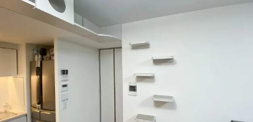 以前はシンプルで家具の少ない空間でしたが、壁に沿ってキャットウォークを設置することで猫の行動範囲が立体的に広がりました。